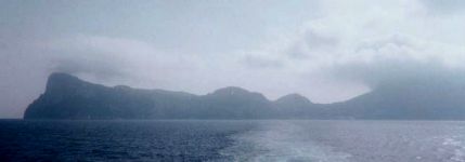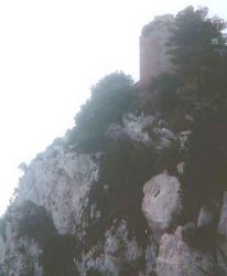 Come ho già detto, il giorno delle mia recente visita a Capri [8/10/2001] vi erano delle nubi che si trovavano più in basso del Monte Solaro e che arrivavano più o meno allo stessa quota della villa Iovis. Per questo motivo, arrivando sulla posizione dell'antica terrazza semi circolare della villa Iovis, mi sono visto circondato da una specie di nebbia che non permetteva di vedere assolutamente nulla nel guardare dritto verso l’orizzonte, né in direzione di capo Miseno, e nemmeno in direzione del più vicino promontorio di Minerva (punta Campanella). Vi era ovunque un velo impenetrabile, d’un colore bianco leggermente tinto d’azzurro, come un cielo brumoso. La visibilità diveniva un po' migliore guardando più in basso, verso la fine della falesia. Là si poteva appena scorgere il blu più scuro del mare, 335 metri più in basso. Ma non appena lo sguardo si allontanava di poco dalla costa, esso si perdeva nuovamente nel nulla bianco-azzurro.