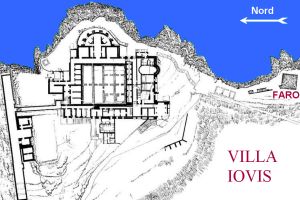 La sagoma di Capri, che si vedeva in direzione delle prora fin da quando avevano doppiato capo Miseno, sembrava sempre alla stessa distanza, agli occhi dell'infelice Elicone, completamente demoralizzato e in piena crisi di pessimismo. Ma l’isola continuava invece ad ingrandirsi: si iniziava a distinguerne sempre più chiaramente le parti principali, che Concordio illustrava a Gaio. Nella zona centrale, la più bassa dell’isola, c'era il porto e l’abitato maggiore. Tutto ciò che si vedeva alla destra del porto costituiva la parte più elevata dell’isola, con una sommità che prendeva il suo nome dal sole [9]. Dall’altro lato il profilo dell’isola sembrava salire con una lieve pendenza dal porto verso l’estremità che si trovava alla nostra sinistra, cioè verso la punta orientale, che era la più prossima al continente, proprio di fronte al promontorio di Minerva [10]. Era proprio su questa estremità di Capri che dovevamo recarci, poiché era lassù che Tiberio abitava normalmente, in una villa che prendeva il nome da Giove e che era arroccata sulla falesia, ad oltre 1100 piedi di altezza al disopra del livello del mare.